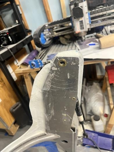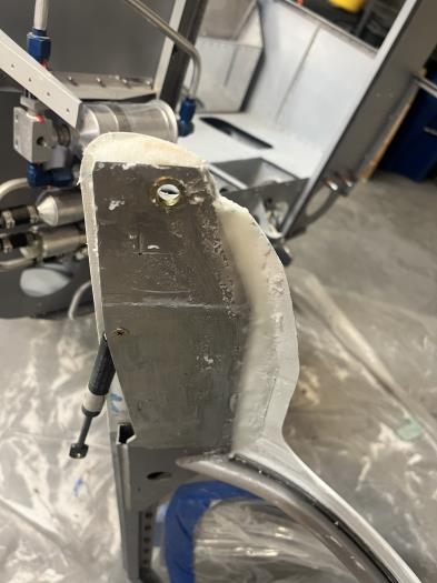 Covered all visible foam with some more epoxy/fibre/flox mixture to a. make the foam more durable (this applied especially to the fromt of the arms and the inside of the pivot holes), b. filled in some gaps on the underside of the fibre glass layup front side (cannot be seen from the front but while I was at it, I thought I could also flatten the surface. Covered it with Mylar tape to create a smooth surface) and c. mixed some fibres under the mixture because the factory finished SLSA has an additional fibre layer on the inside of the arms. While the instructions do not specifically demand it, I thought this to be a smart idea, especially since the fibers are somewhat enhancing the rigidity of the fibre glass form and additionally binding the epoxy form to the metal from the top.