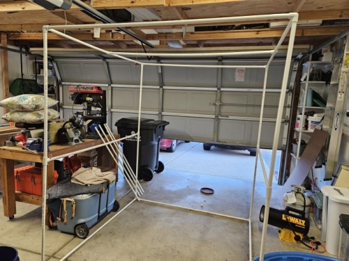 Purchased 1/2" PVC pipe and joiners to make a paint booth. Did a test fit in the garage. Booth is 5 feet wide and 5 feet deep, and 6 feet tall. Also bought plastic sheeting, drill-mounted paint mixers, and 2 buckets to fill with rinse water for the Prekote.